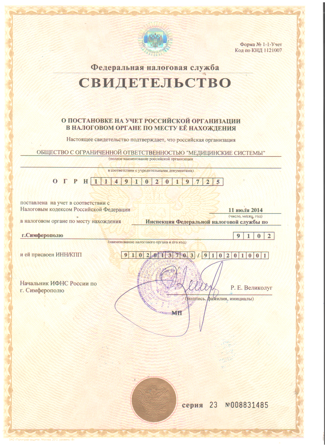 СВИДЕТЕЛЬСТВО О ПАСТОНОВКЕ НА УЧЕТ В НАЛОГОВОМ ОРГАНЕ